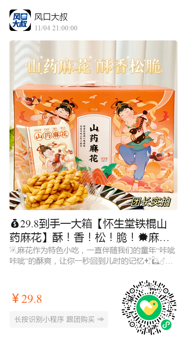 29.8到手一大箱【怀生堂铁棍山药麻花】酥!香!松!脆!💥麻花界天花板来啦❗酥脆过瘾,满口留香!酥掉牙🦷 建议一次囤2箱,因为太好吃,一箱不够的❗ 添加≥25%的铁棍山药,是真正健康养生零食 全新真空低温油炸💫比普通麻花好吃又健康,好吃到停不下来~