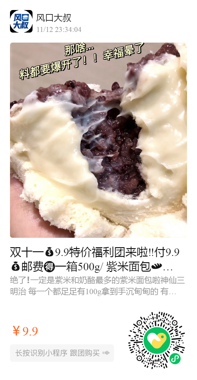 双十一9.9特价福利团来啦‼️ 付9.9邮费一箱500g/ 紫米面包 月销10w+的软糯紫米奶酪夹心早餐面包🤤 一箱5个扎扎实实独立包装足足有500g 🏻 超好吃😋奶香浓郁🥛片片松软 口口新鲜 早餐好伴侣【吐司➕奶酪➕紫米】香甜好滋味 短保食品更健康