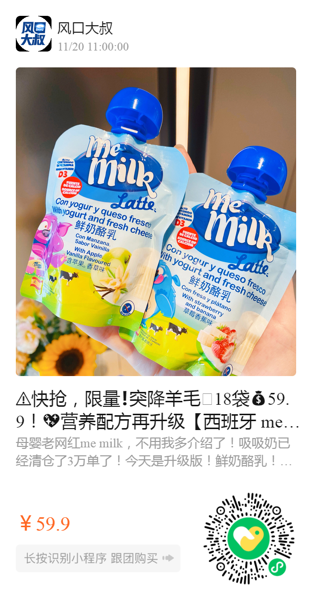 ️快抢,限量❗️突降羊毛🦙18袋59.9!💖营养配方再升级【西班牙 me milk 儿童鲜奶酪乳】>12%新鲜奶酪添加量!