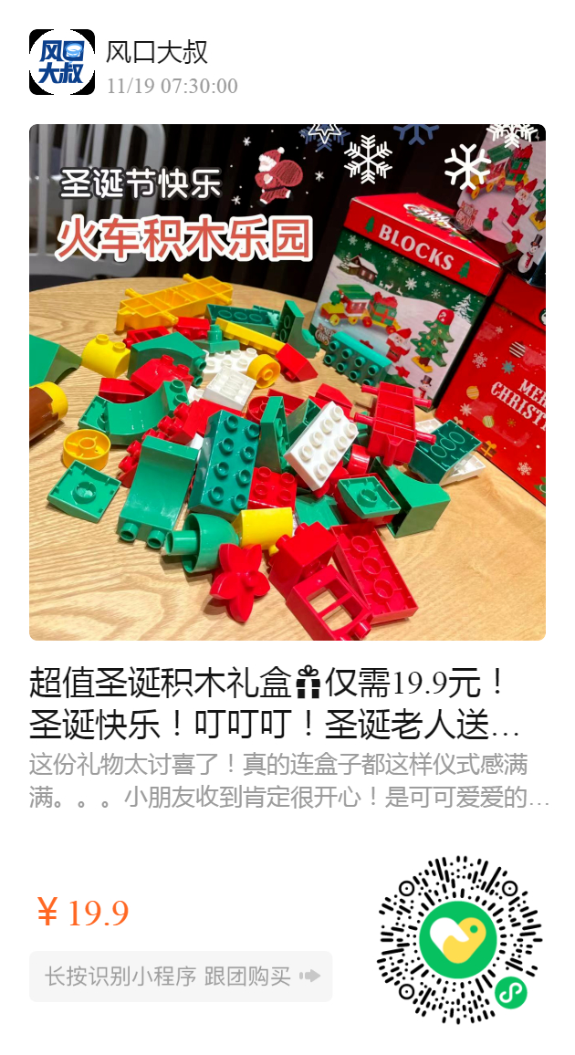 超值圣诞积木礼盒仅需19.9元! 圣诞快乐!叮叮叮!圣诞老人送礼物咯! 即刻拥有超精致圣诞礼盒,体验开箱的快乐 超好玩圣诞积木乐园,赶紧给小朋友入手一份! ✅60件套大颗粒积木 ✅体验拼搭的乐趣 ✅构建圣诞场景 ✅简单易上手孩子玩得超开心~