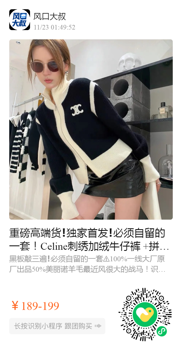 重磅高端货❗️独家首发❗️ 必须自留的一套! Celine刺绣加绒牛仔裤 +拼接羊毛开衫 ️这个秋冬要留为数不多的好货 𝟱𝟬%美丽诺羊毛 质感软糯,上身不扎人 黑白拼色高级百搭,尽显法式经典! 一套搭配,堪称完美❗️