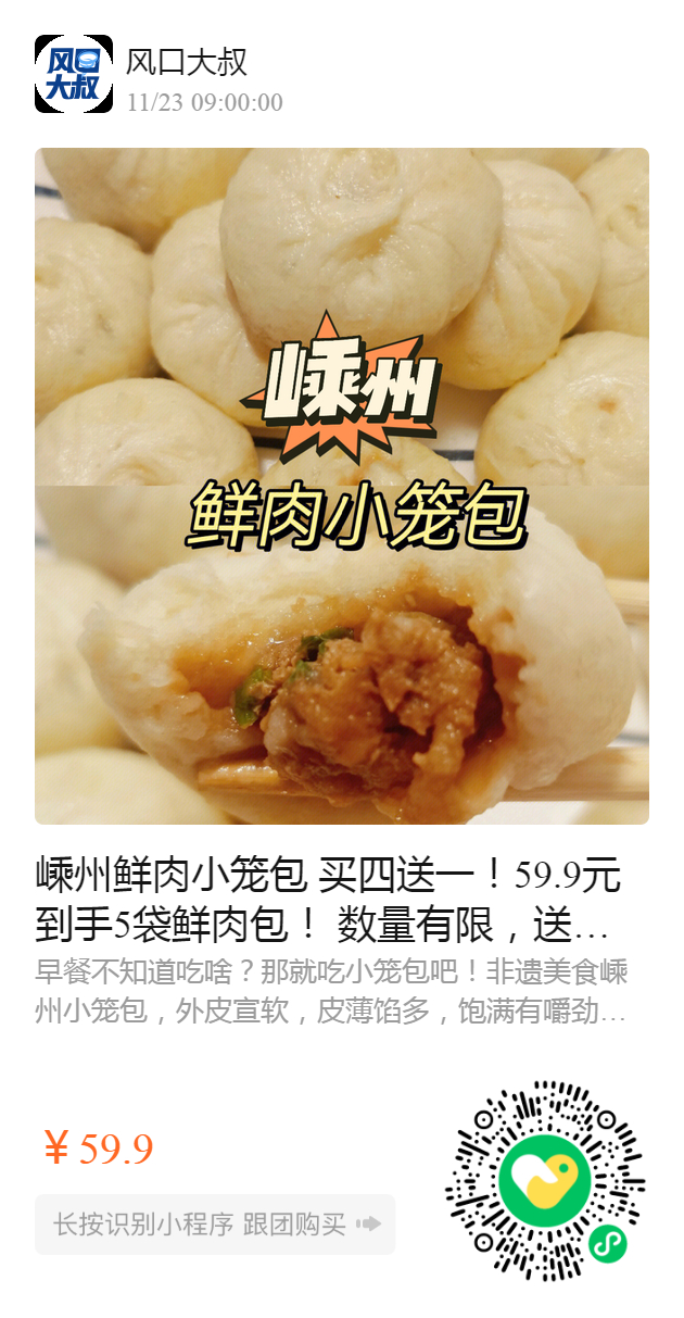 嵊州鲜肉小笼包 买四送一!59.9元到手5袋鲜肉包! 数量有限,送完即止❗