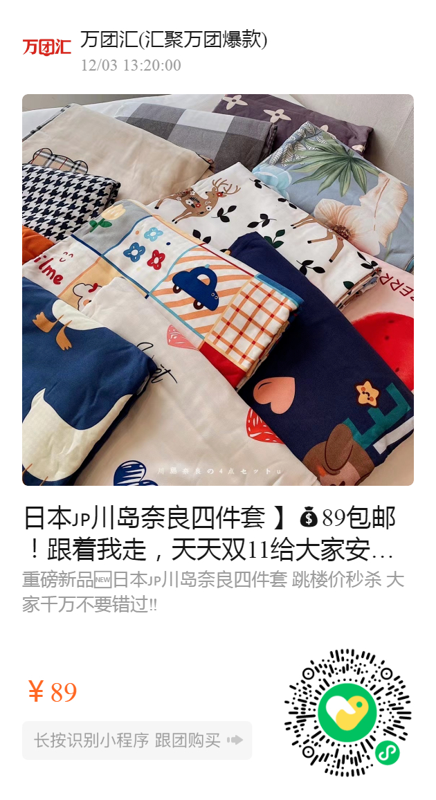 日本川岛奈良四件套 】89包邮!跟着我走,天天双11给大家安排起来! 还记得上个月抢爆了的日本川岛奈良羽绒被吗?!两天卖空老板库存,然后老板让我帮着把四件套也清一清‼️面料 磨毛棉89超值啊‼️‼️ 一看到就自留了两套!别提多舒服了