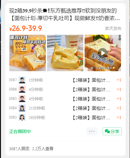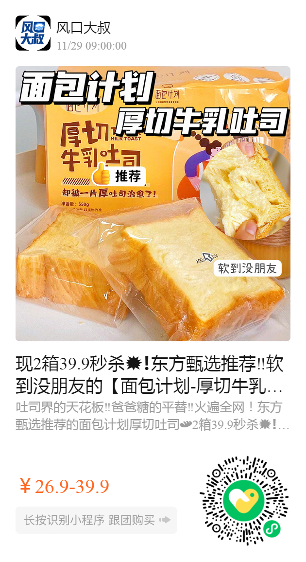现2箱39.9秒杀💥❗️东方甄选推荐‼️软到没朋友的【面包计划-厚切牛乳吐司】现做鲜发‼️奶香浓郁的超过瘾️ ️口感绵密,甜度适中,超奶的吐司咬下去超松软贼软嫩,是早餐的不错之选~吃上一口,幸福感爆棚!!! ️性价比超高!点击下方链接↓↓↓快递到家