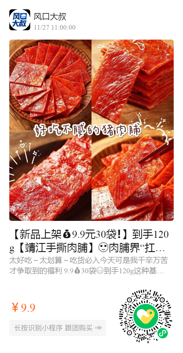 【新品上架9.9元30袋❗️】到手120g【靖江手撕肉脯】肉脯界“扛把子”,坚持传统工艺出自靖江的地道美食产品巨好吃 ✅优质的猪后腿肉 ✅优质鸡胸肉 ✅搭配鱼露 ✅全蛋液等配料 传统人工炭火持续约6小时制作而成少油脂,好嚼劲,巨巨巨好吃😋独立小包装,三味可选(香辣味、原味、蜜汁味)