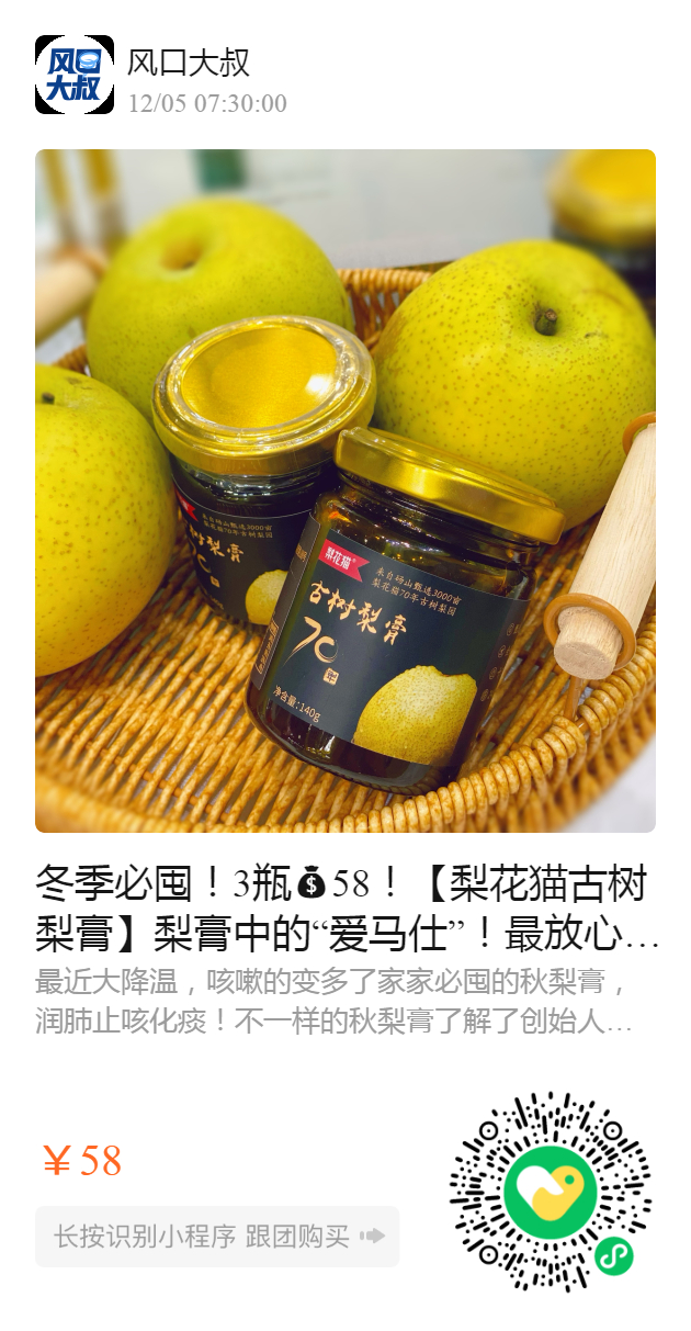 冬季必囤!3瓶58!【梨花猫古树梨膏】梨膏中的“爱马仕”!最放心的纯鲜果梨膏!!上团热卖万单复团!