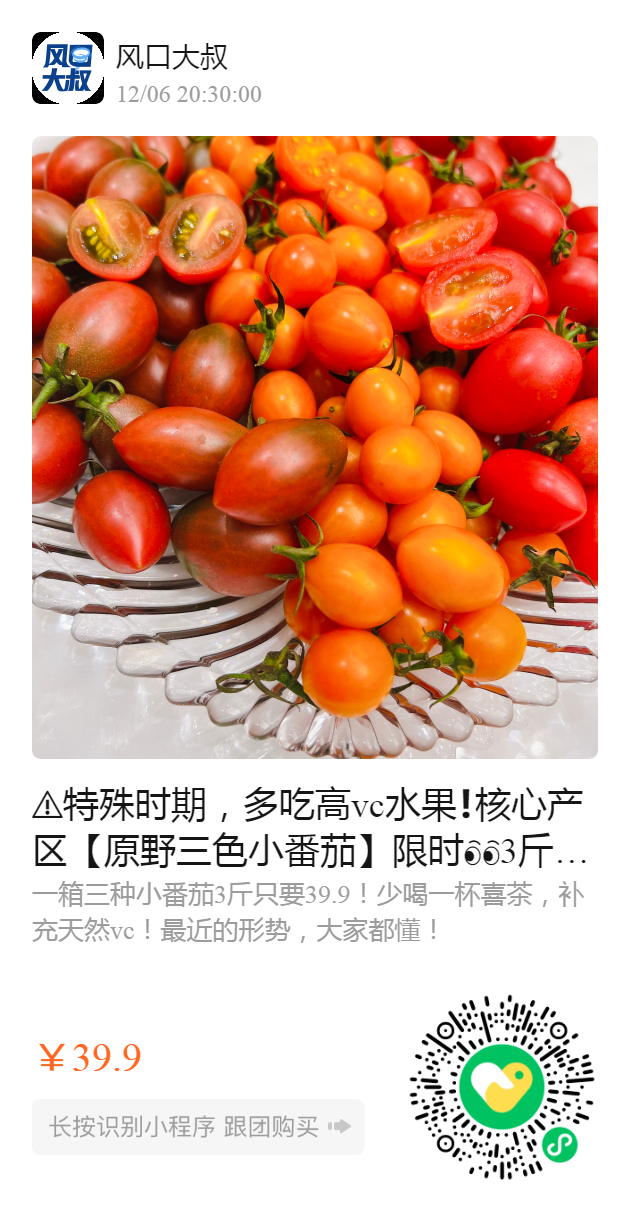️特殊时期,多吃高vc水果❗️核心产区【原野三色小番茄】限时3斤组合秒杀价39.9元/箱!! 🔸金玲珑🔸千禧🔸紫弹头! ✅核心产区,远离污染 ✅自然成熟,纯正番茄香 ✅酸甜爆汁,维生素水炸弹