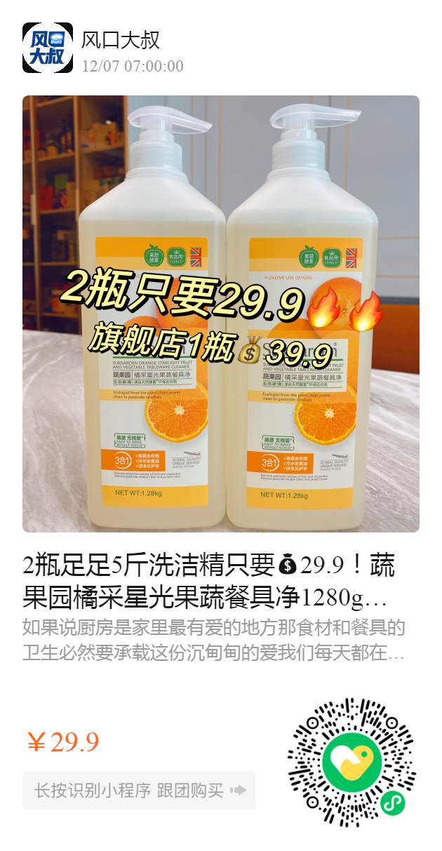2瓶足足5斤洗洁精只要29.9!蔬果园橘采星光果蔬餐具净1280g! 爱了爱了爱了!洗碗洗水果蔬菜都可以!一用就停不下来了!厨房界的颜值担当,一起守护你爱的家人! 旗舰店1瓶39.9,我们2瓶29.9 2024.12