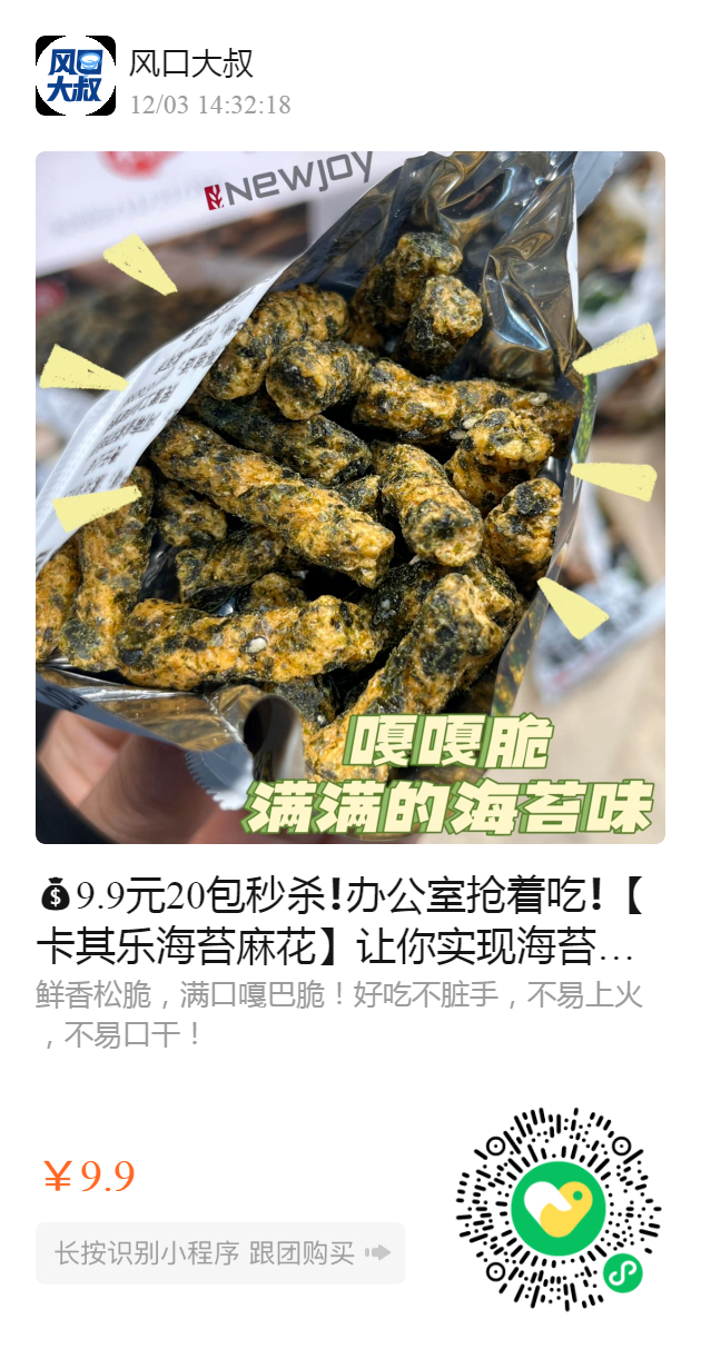 9.9元20包秒杀❗办公室抢着吃❗ 【卡其乐海苔麻花】让你实现海苔麻花自由❗ ✅配料表超干净,妈妈见了都放心❗ ✅微微甜加上丝丝咸味,直呼太过瘾了❗ ✅酥!香!松!脆!全员安利💞 追剧时再也不缺小零食吃了 犒赏好嘴巴,心情也会变听话