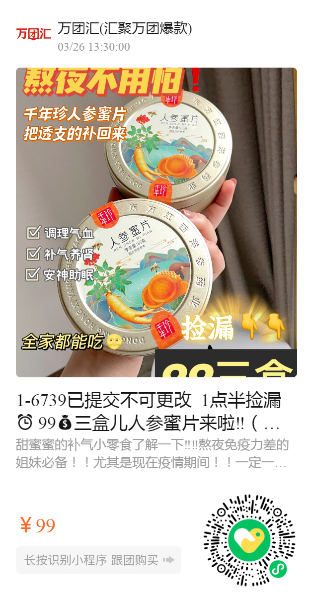1-6739已提交不可更改 1点半捡漏⏰ 99三盒儿人参蜜片来啦‼️(原价99一盒!!!)