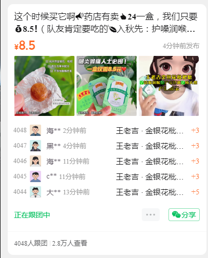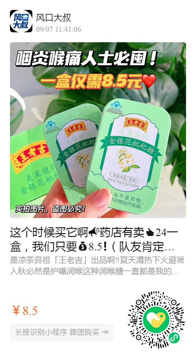 这个时候买它啊药店有卖24一盒,我们只要8.5❗️(队友肯定要吃的入秋先:护嗓润喉🏻转头看向【王老吉】金银花➕枇杷王牌组合🥇