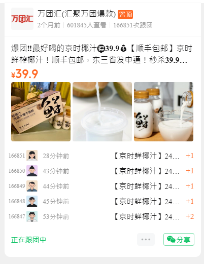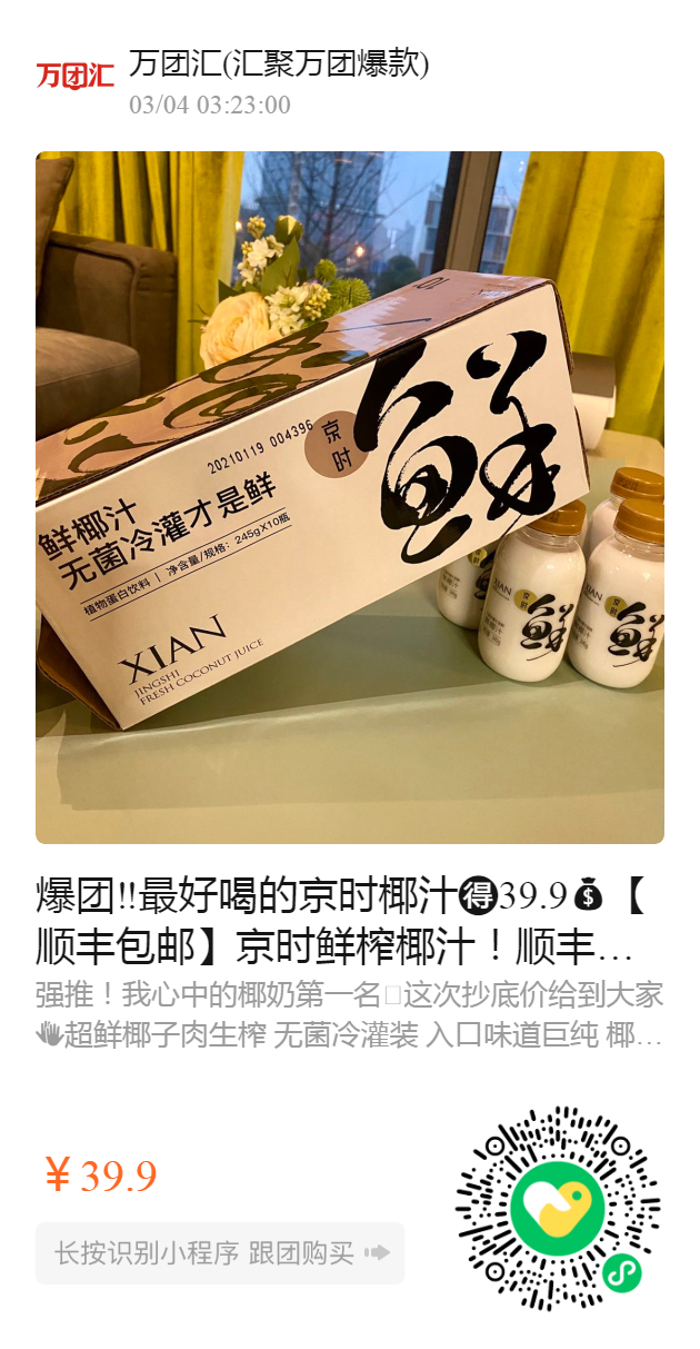 爆团‼️最好喝的京时椰汁️39.9【顺丰包邮】京时鲜榨椰汁!顺丰包邮,东三省发申通!秒杀39.9【好评N团】好喝到忘不了的椰汁!富含植物蛋白!老少皆宜不长胖,京时鲜椰汁——直播间推荐!这是无菌冷灌鲜,比某树更美味! 女孩子更要多喝椰汁,富含钾元素不容易水肿~