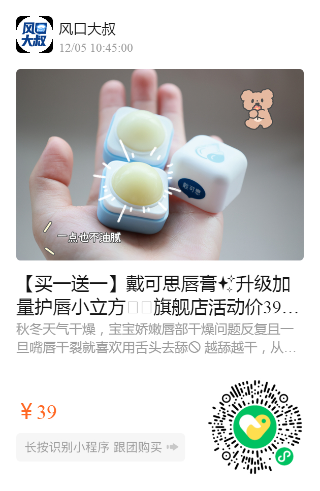【买一送一】戴可思唇膏升级加量护唇小立方🏻 旗舰店活动价39一支💥今日团价两支仅需39 球形膏体不易断裂💥更贴合宝宝唇型🌱拯救这个秋冬唇部的干燥 四大植物精萃🌿五大无添加新生儿也能放心用🏻 倍润保湿专为娇嫩唇周研发💕孕妈均可用🏻冬季必备 活动12月31日结束