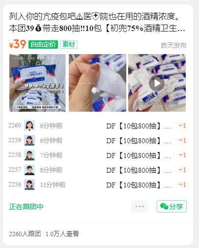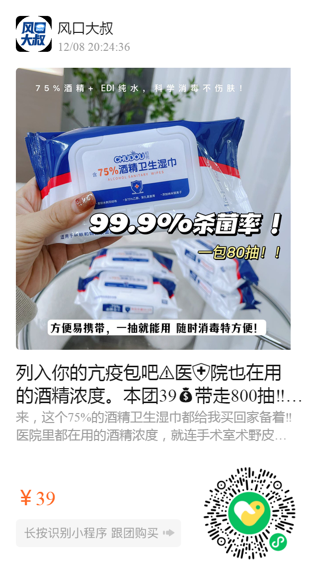 列入你的亢疫包吧️医院也在用的酒精浓度。本团39带走800抽‼️10包【初兜75%酒精卫生湿巾】同行500片都50多💥我们平均一片3毛钱。内外塑膜包装的设计,保湿度更高。