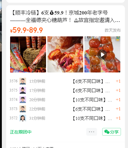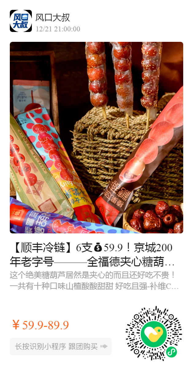 【顺丰冷链】6支59.9!京城200年老字号———全福德夹心糖葫芦!