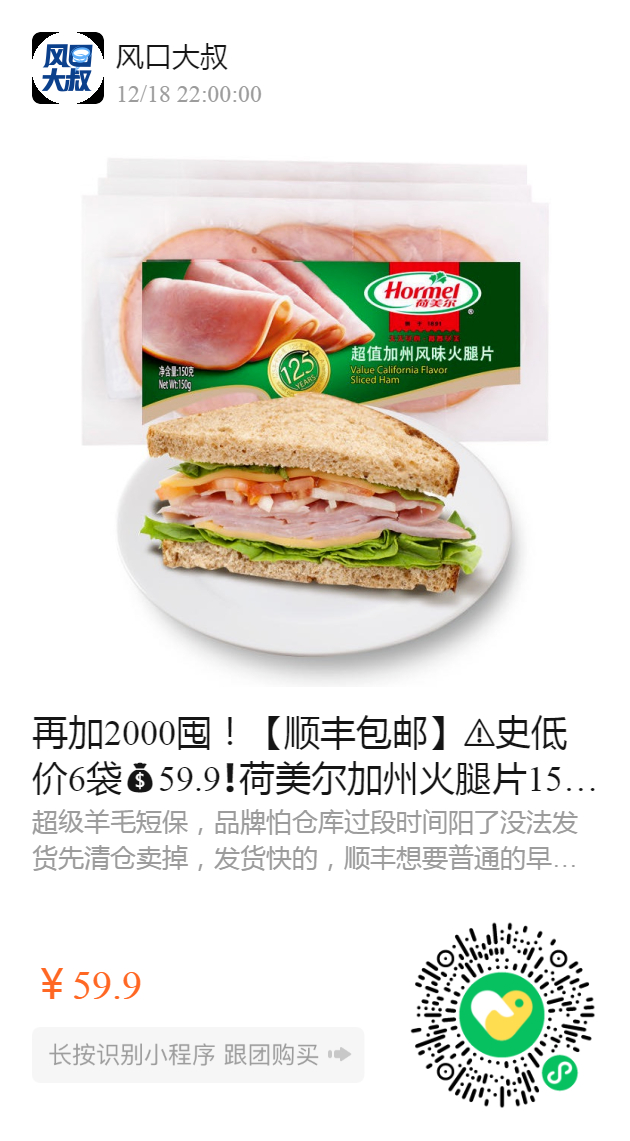 再加2000囤!【顺丰包邮】️史低价6袋59.9❗️荷美尔加州火腿片150g,盒马超市27.8一袋,我们买五袋加州火腿片再送一袋轻享鸡胸切片!