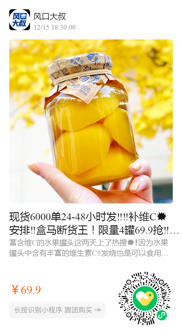 更有“桃梨疫情”“枇事没有”限定组合装(黄桃1雪梨1杨梅1枇杷1)