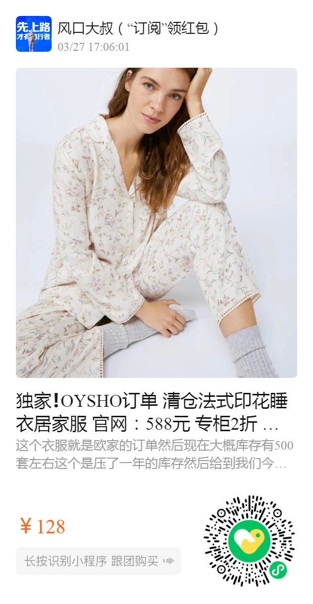 独家❗️OYSHO订单 清仓️法式印花睡衣居家服 官网:588元 专柜2折 吸湿透气 像丝绸一样 特别适合春夏季节️自带法式慵懒 500套库存