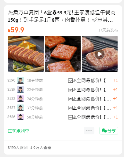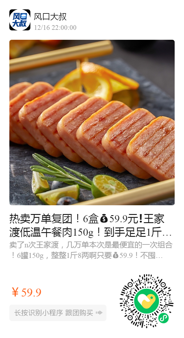 热卖万单复团!6盒59.9元❗️王家渡低温午餐肉150g!到手足足1斤8两,肉香扑鼻!