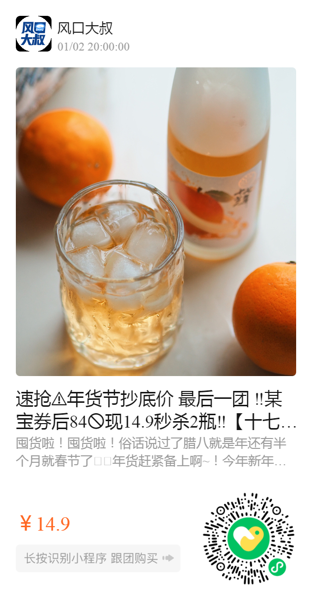 速抢️年货节抄底价 最后一团 ‼️某宝券后84🚫现14.9秒杀2瓶‼️【十七光年清型米酒】向往的生活同款果酒🥃 可颜可甜,超好喝~不是酒鬼少女也一口接一口 过年小聚肯定少不了来一杯,酒精含量低安心小酌🚫不添加任何防腐剂色素,安全放心喝~ 高颜值礼盒用来春节送礼也是不错的选择~