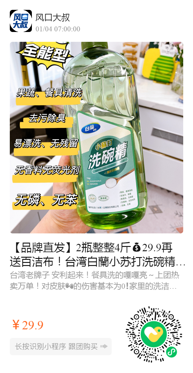【品牌直发】2瓶整整4斤29.9再送百洁布!台湾白蘭小苏打洗碗精1kg,山姆同款卖62.5/2瓶❗
