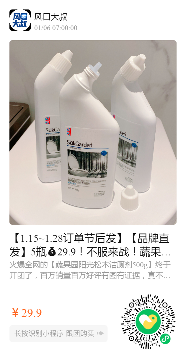 【1.15~1.28订单节后发】【品牌直发】5瓶29.9!不服来战!蔬果园挑战全网最好用|性价比最高洁厕剂! 大师级别的测评!快来薅羊毛~ 洁厕剂500ml旗舰店1瓶19.9元 我们团购5瓶29.9元! 地板清洁剂500g旗舰店2瓶39.9元 我们团购3瓶29.9元! 2025.3