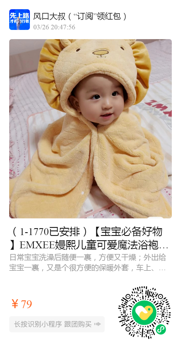 (1-1770已安排)【宝宝必备好物】EMXEE嫚熙儿童可爱魔法浴袍来啦,可可爱爱,快速吸水,浴袍也不会湿哒哒. 某宝199,我们开团79包邮!!! 礼盒装自用送人都很完美. 外面乱七八糟买个材料不放心的,还不如推荐你趁折扣好入手一个专业母婴品牌的️