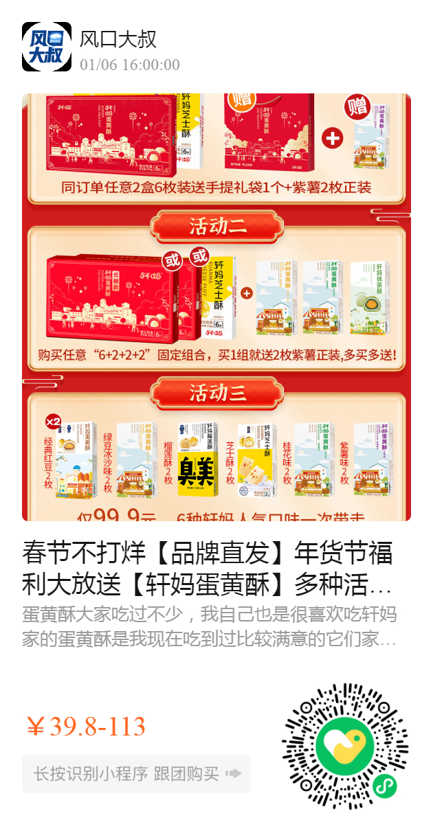 春节不打烊【品牌直发】年货节福利大放送【轩妈蛋黄酥】多种活动,超丰富,任你选择✔️ 🔺任意口味2盒六枚装,赠送2枚紫薯正装➕1个轩妈新春礼袋! 🔺6+2+2+2组合,限时赠送2枚紫薯酥正装! 全部发货前现做现发❗️