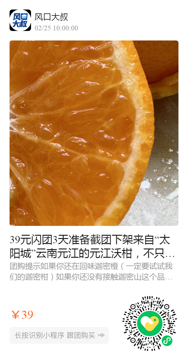 39元闪团3天 准备截团下架 来自“太阳城”云南元江的元江沃柑,不只有像蜜一样的甜🍯,更是一口爆汁、鲜嫩可口,像布丁一样爽滑脆爽的“蜜甜爆汁柑”。 现摘现发,给你原汁原味的体验,是你不能错过的柑橘界“黑马”