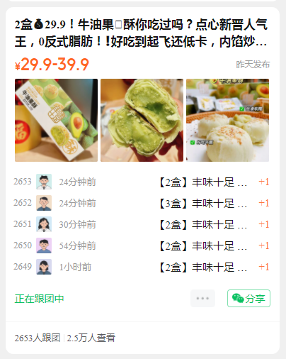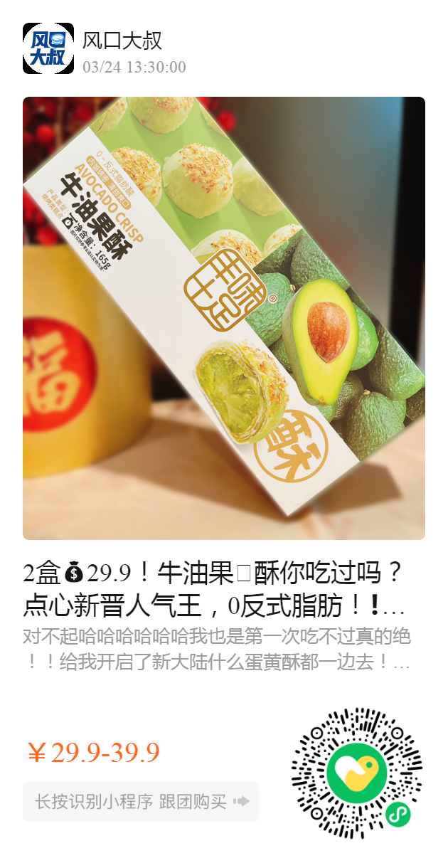 2盒29.9!牛油果🥑酥你吃过吗?点心新晋人气王,0反式脂肪!❗️好吃到起飞还低卡,内馅炒鸡绵密牛油果口感细腻还特别清爽~真的好吃到爆❗️ ✅软滑似乳酪,冰激凌口感入口超惊艳❗️ ✅甜而不腻,每一口都酥到掉渣~ ✅健身博主人手一个,热量真的低 165g/盒 3只装 新日期