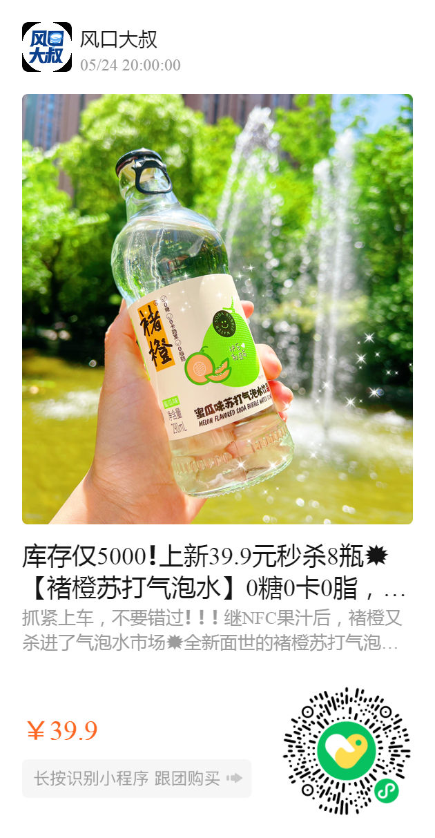 库存仅5000❗️上新39.9元秒杀8瓶💥【褚橙苏打气泡水】0糖0卡0脂,轻负担✅气量十足,冰爽清凉!一口活力满分💯 橙花、葡萄、密瓜三种口味的汽水🧊超清爽,还有淡淡回甘,喝上一口就爱上️ 配方增加维生素B6,B12,以及膳食纤维❗️❗️营养好喝还不长胖!以后的夜宵搭子就是它了