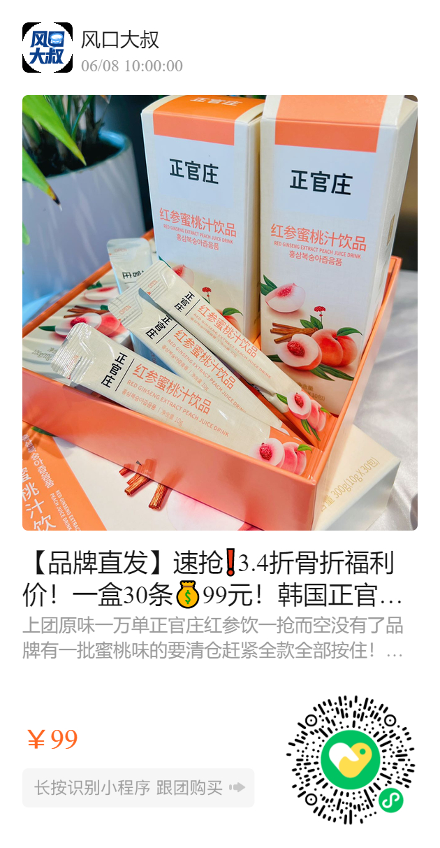 【品牌直发】速抢❗️3.4折骨折福利价!一盒30条99元!韩国正官庄红参蜜桃饮,美容养颜补气养血,抗疲劳,增加免疫力!正品带防伪!