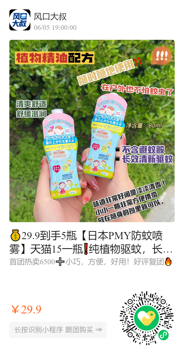 29.9到手5瓶【日本PMY防蚊喷雾】天猫15一瓶❗️纯植物驱蚊,长达6h的驱蚊防护好闻不刺鼻,孕妇儿童放心用!❗️