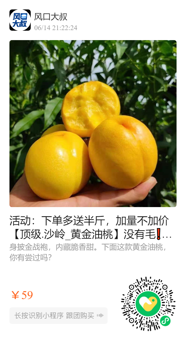 活动:下单多送半斤,加量不加价 【顶级.沙岭_黄金油桃】没有毛❗️黄皮,浓郁的桃香水分超足,软吃一口爆汁香甜️ 一分钱一分货,我们只卖最好吃的桃 黄金油桃🍑可以说是油桃界的“爱马仕”!生态种植出的地理标志保护产品,黄金油桃品种多,我们只选取最好吃的发货