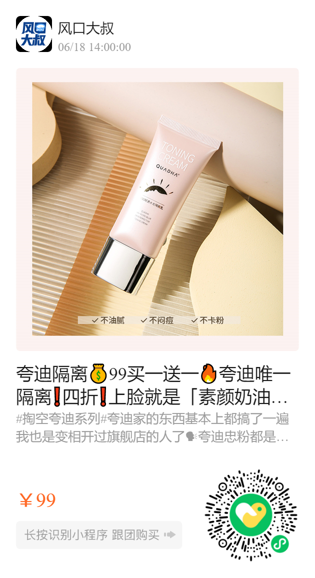 夸迪隔离99买一送一 夸迪唯一隔离❗️四折❗️上脸就是「素颜奶油肌」😎后续上粉底服服帖帖🏻猛加三大玻尿酸专利 华熙生物亲儿子️【夸迪5D玻尿酸·水光隔离霜】柔焦奶油肌质感轻微提亮,肤感超水润淡淡柑橘香填充毛孔效果巨牛‼️ 🗣你可以永远相信相信❗️夸迪❗️