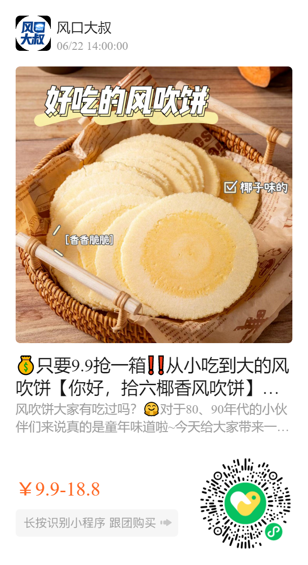 只要9.9抢一箱❗❗从小吃到大的风吹饼【你好,拾六椰香风吹饼】薄香酥脆老少皆宜健康营养🏻 ️一箱有10袋包含约60片只要9.9❗两箱约120片只要18.8❗ ️谷香浓郁!不油不腻! 重温童年味道给宝宝们吃也可以,片片都是爱吃起来很上头