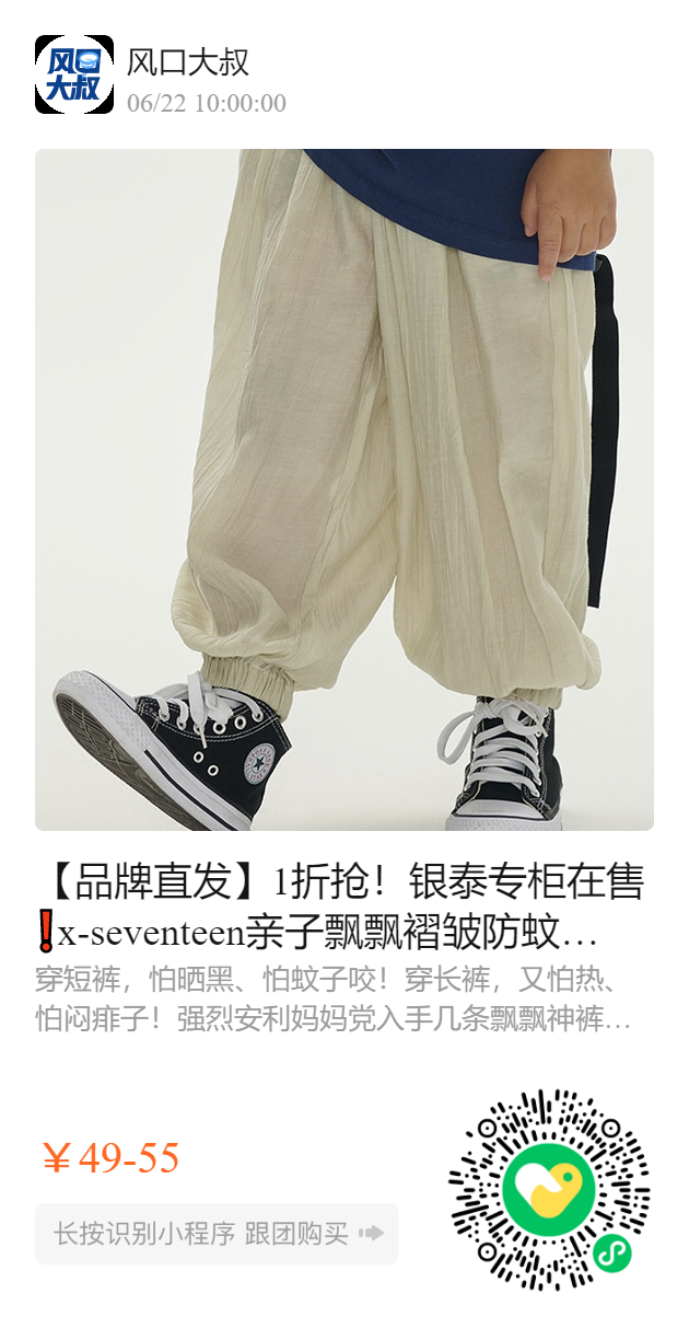 【品牌直发】1折抢!银泰专柜在售❗x-seventeen亲子飘飘褶皱防蚊裤!日本高岛屋商城品牌!
