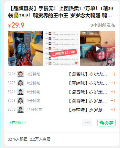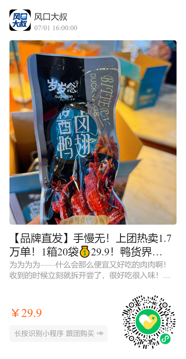 【品牌直发】手慢无!上团热卖1.7万单!1箱20袋29.9!鸭货界的王中王-岁岁念大鸭翅-鸭翅中的绝绝子!