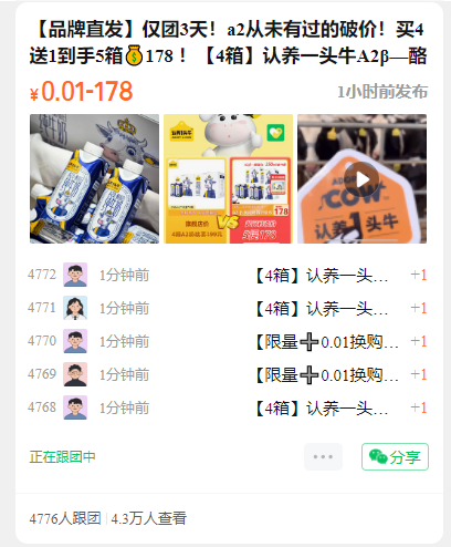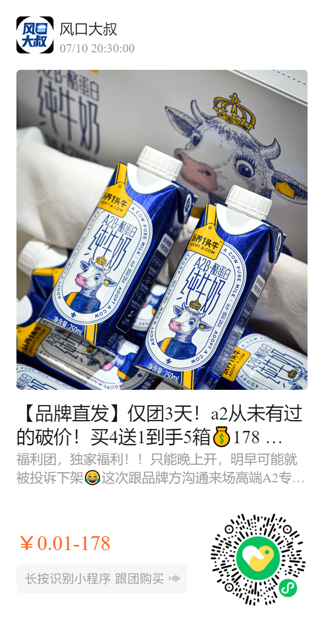 【品牌直发】仅团3天!a2从未有过的破价!买4送1到手5箱178 !【4箱】认养一头牛A2β—酪蛋白纯牛奶+0.01赠【1箱】认养一头牛全脂纯牛奶!