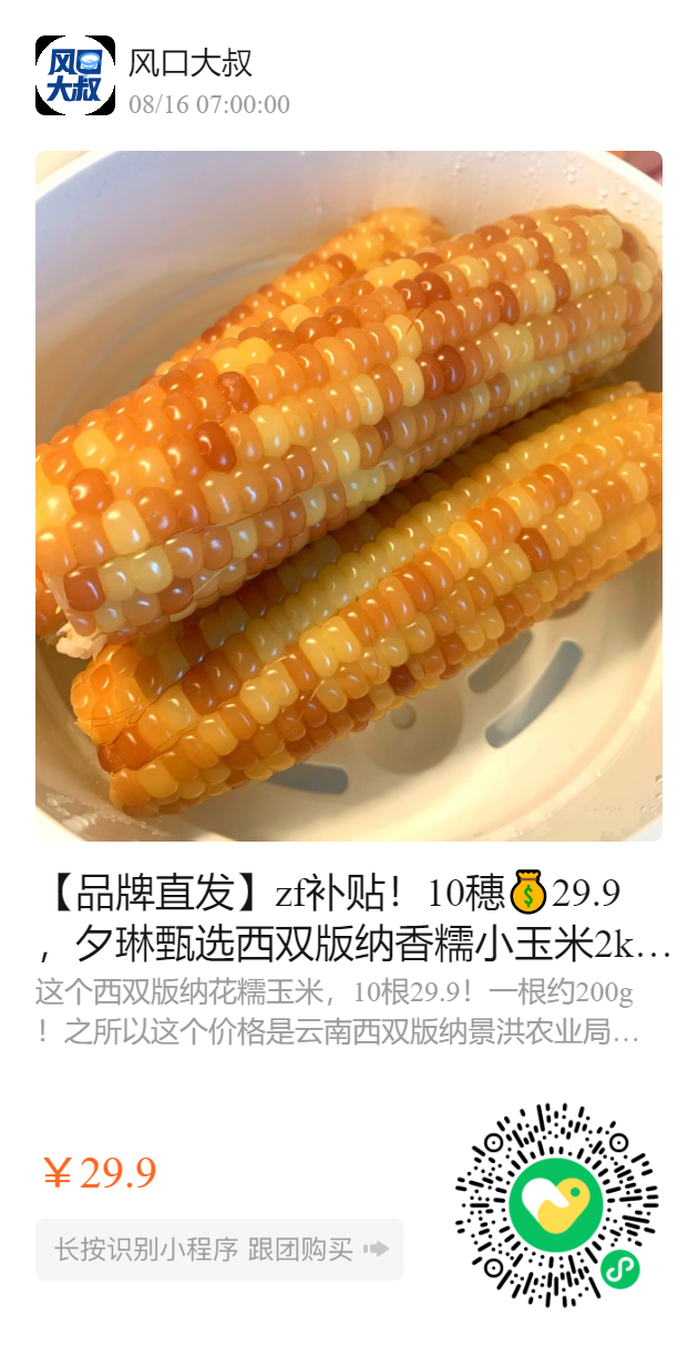【品牌直发】zf补贴!10穗💰29.9,夕琳甄选西双版纳香糯小玉米2kg🌽香甜软糯!西双版纳景洪农业局助农补贴项目,限量补贴5000箱,具备好吃玉米的所有条件! ✅原始品种,自然种植 ✅无香精无添加无防腐剂 ✅高温杀菌真空包装,极速锁鲜 新鲜采摘,保质期6个月