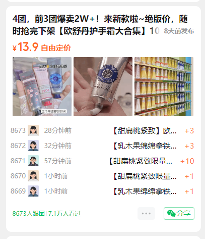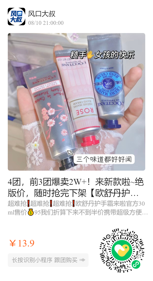 4团,前3团爆卖2W+!来新款啦~绝版价,随时抢完下架【欧舒丹护手霜大合集】10ml随身中样,任意3支包邮 ✅乳木果暖栗森林、樱花、甜扁桃、马鞭草....7种经典香型 ✅保湿滋润不粘腻 ✅细腻柔滑,防干裂修复 📍渠道:国内专柜 📅效期:2025年