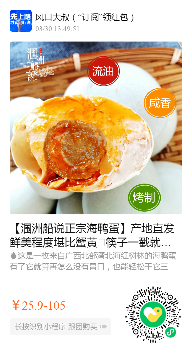 【涠洲船说正宗海鸭蛋】产地直发 鲜美程度堪比蟹黄😮筷子一戳就爆油的涠洲船说海鸭蛋!满口留香,又沙又软,没胃口也能干三碗饭!已连续畅销300万件🏻 海鲜喂养,红泥腌25天左右,滋滋冒油,香醇又沙糯,OMG,😋这辈子一定要吃一次正宗的大品牌涠洲船说海鸭蛋