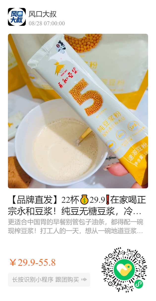 【品牌直发】22杯💰29.9❗在家喝正宗永和豆浆!纯豆无糖豆浆,冷水也可以冲泡!夏天喝冰豆浆超爽!