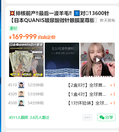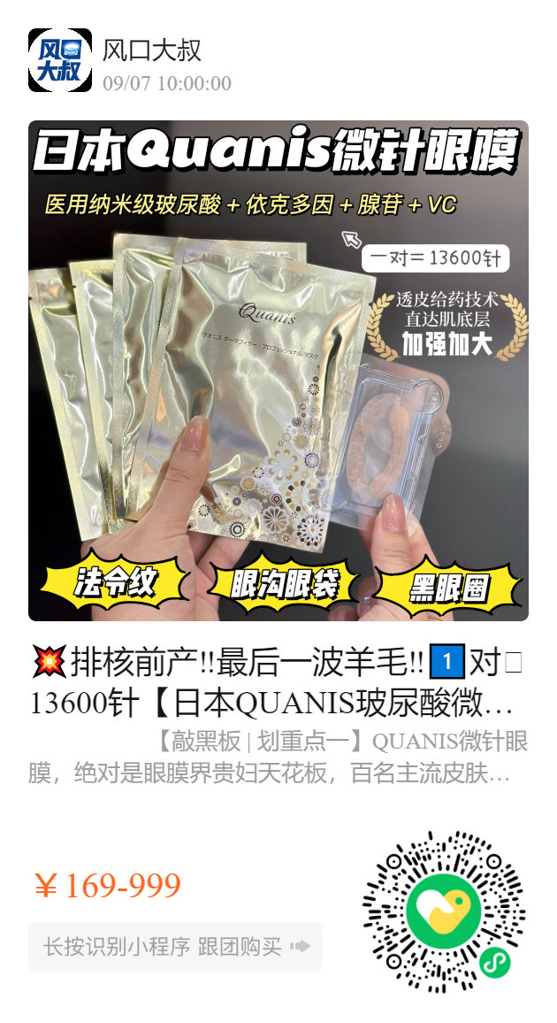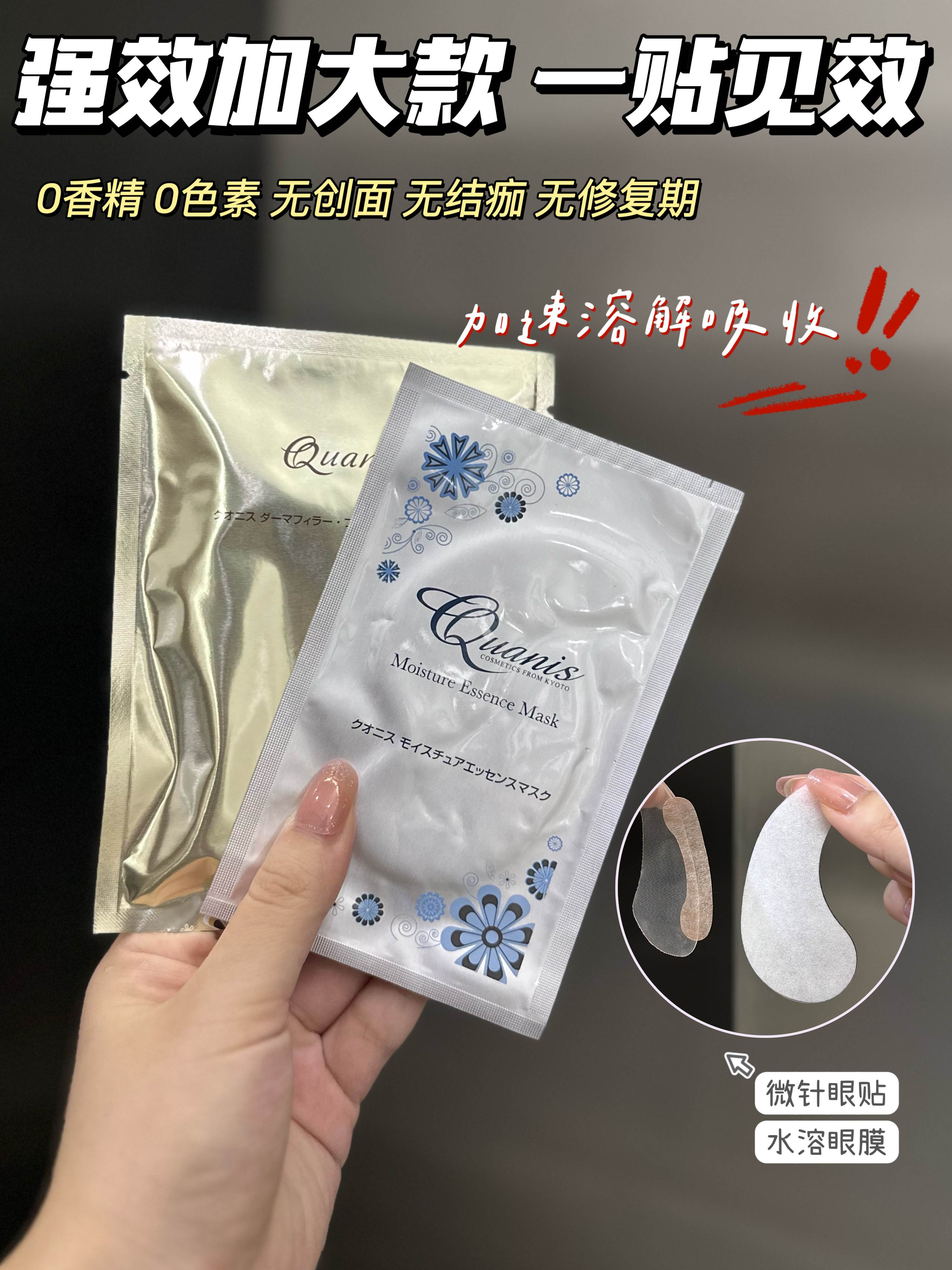 1️⃣对🟰13600针【日本QUANIS玻尿酸微针眼膜至尊版】医用纳米玻尿酸➕水解胶原➕依克多因➕腺苷等良心成分,各类眼纹、泪沟凹陷、黑眼圈、眼袋问题一扫而光
