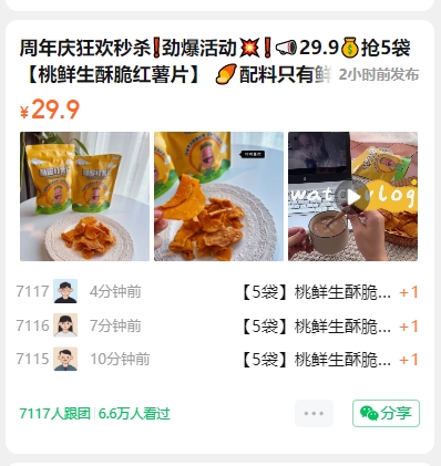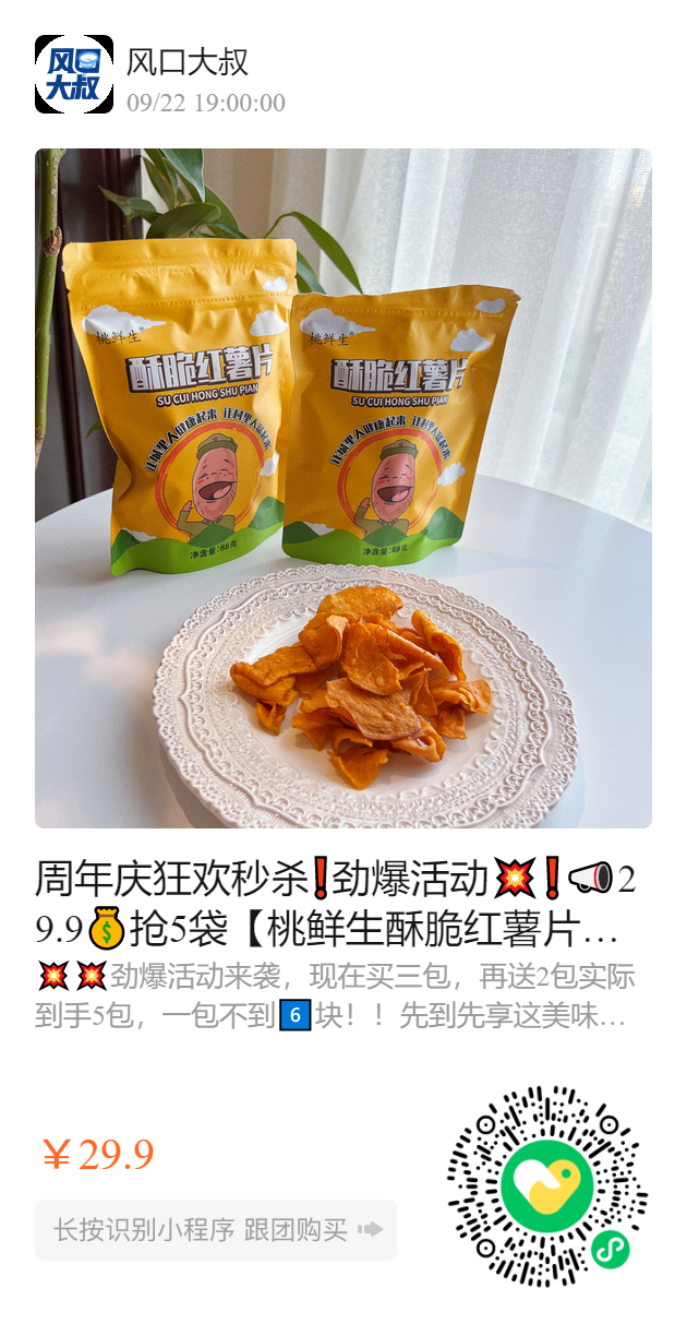 周年庆狂欢秒杀❗劲爆活动💥❗📣29.9💰抢5袋【桃鲜生酥脆红薯片】 🍠配料只有鲜红薯、白砂糖、食用植物油🙅♂️无添加剂!防腐剂! 选用烟薯25号薯芯制作,一级红薯片‼️香!甜!酥!脆!好吃的根本停不下来