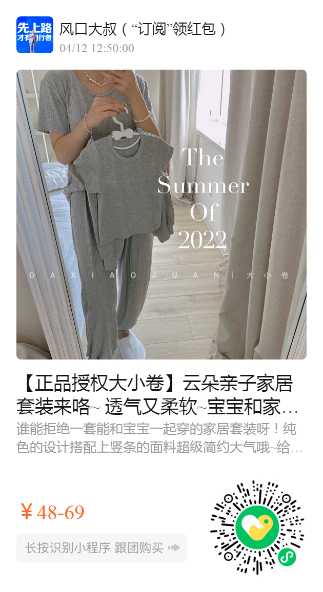 【正品授权大小卷】云朵亲子家居套装来咯~ 透气又柔软~宝宝和家长的款都有哦~一起和宝宝安排一套亲子装吧!平时居家也好外出也好都可以穿哦当睡衣穿都可以!宽松的版型简约又不简单!宝妈们和宝宝一起安排上吧!!