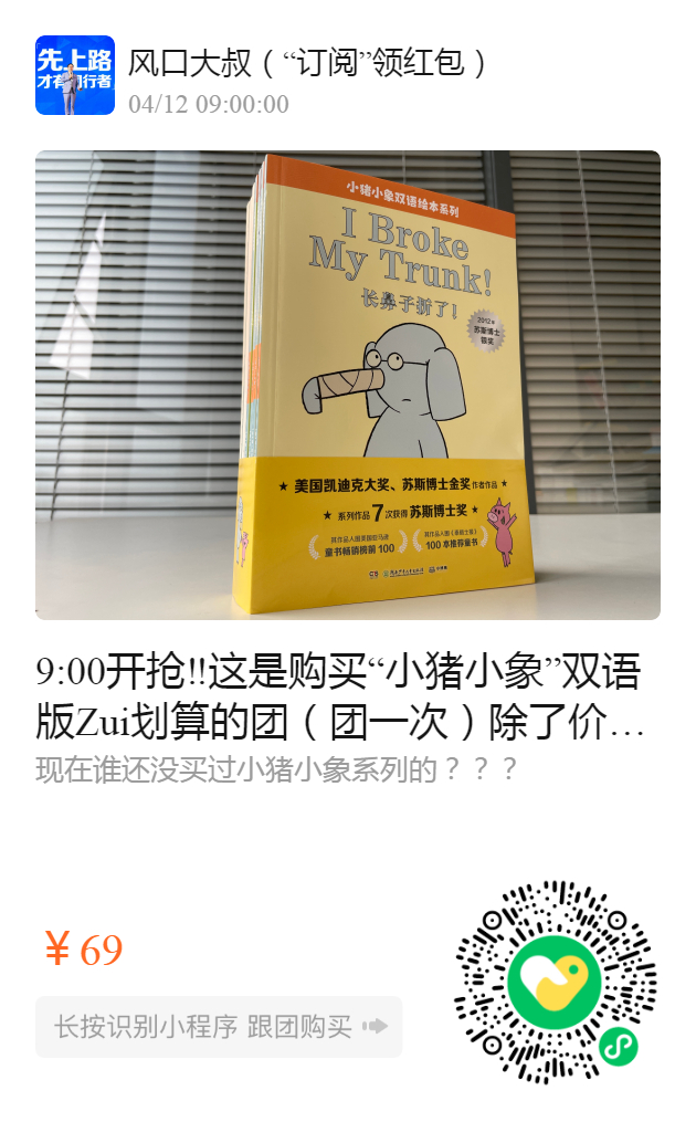 9:00开抢‼️这是购买“小猪小象”双语版Zui划算的团(团一次) 除了价格划算外,再送俩赠品+中英16个音频(书后扫码) 拥有这套书,可以满足和孩子手指舞台剧+自主双语阅读+磨耳朵的三倍效果,一套顶三套