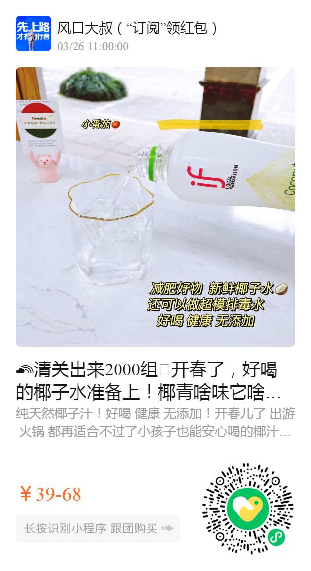 给你宛若初摘的新鲜~减脂期必备饮品配料只有椰子水!0脂肪0胆固醇补水无负担、低卡享味天然🉑️清新包装、易携带,旅行外出随时随地享受美味~