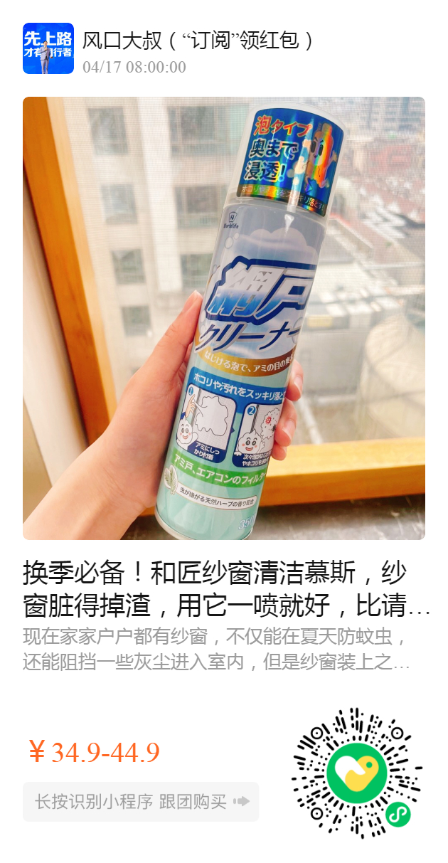 换季必备!和匠纱窗清洁慕斯,纱窗脏得掉渣,用它一喷就好,比请10个保洁阿姨都有效,超好用!泡沫自动分解免清洗,超级方便!