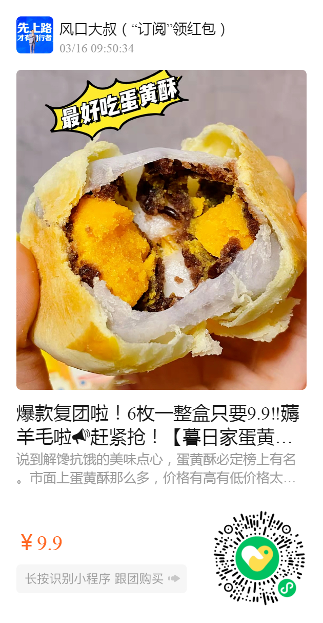 爆款复团啦!6枚一整盒只要9.9‼️薅羊毛啦赶紧抢!【暮日家蛋黄酥】这个品质,这个价格,快5盒10盒买,超值!🤩当早餐、下午茶、宵夜都超棒! 味道特别好,你们都懂得!从酥皮、雪媚娘、豆沙到蛋黄,用料超足,每一口都香酥软糯~🤤 低糖低卡~超好吃 没尝过对不起自己!【9.9元福利团】